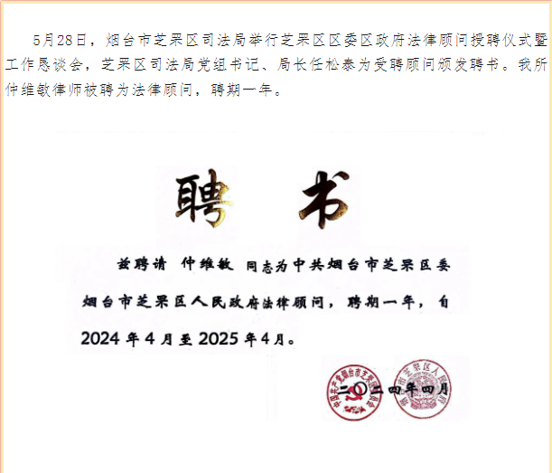 信谊荣誉 | 仲维敏律师获聘芝罘区政府法律顾问